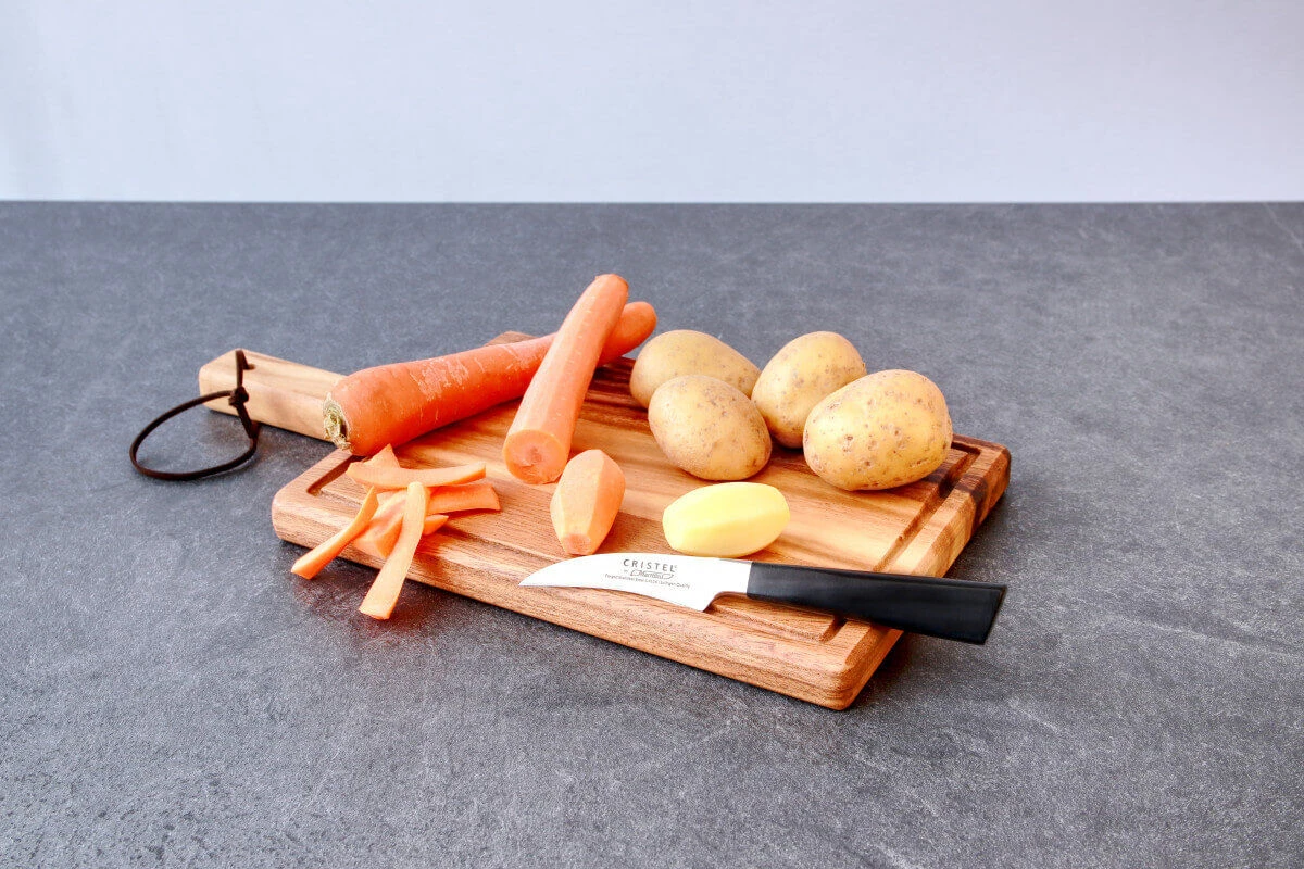 Voor de messenlijn heeft het Franse pannenmerk Cristel de hulp ingeroepen van het Finse Marttiini, dat sinds 1928 messen produceert. Het staal dat gebruikt wordt voor de messen wordt in het Duitse Solingen gesmeed. De kunststof greep is eenvoudig in onderhoud en erg robuust. Elk van de messen heeft voor het heeft een zogeheten krop, waardoor zich geen vuil kan ophopen tussen lemmet en heft, en de gewichtsverdeling van het mes prettig is. De Cristel Marttiini messen worden geleverd met een beschermhoes om het lemmet en uw vingers te beschermen.