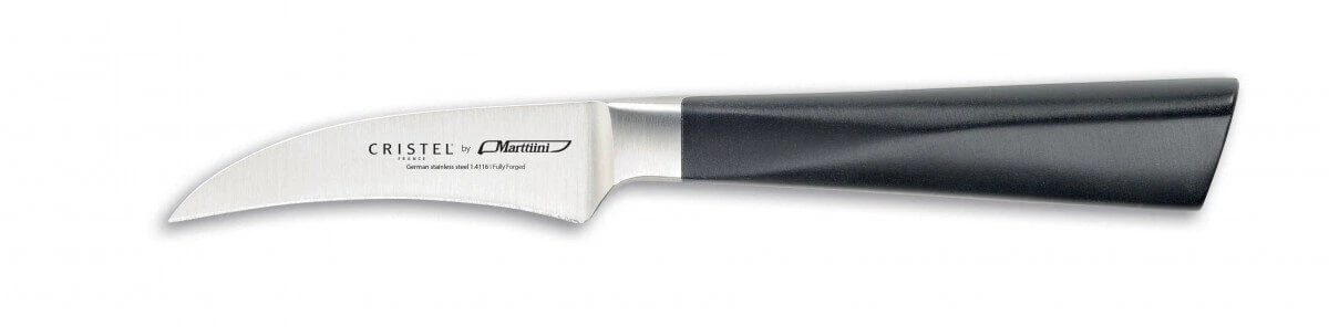 Het Cristel Marttiini tourneermes is gemaakt van messenstaal met een kunststoffen handgreep. Het messenstaal loopt door de gehele heft door en het lemmet is 7 cm lang. Door de gekromde vorm kan het tourneermes gebruikt worden als schilmes of om groenten te tourneren.
