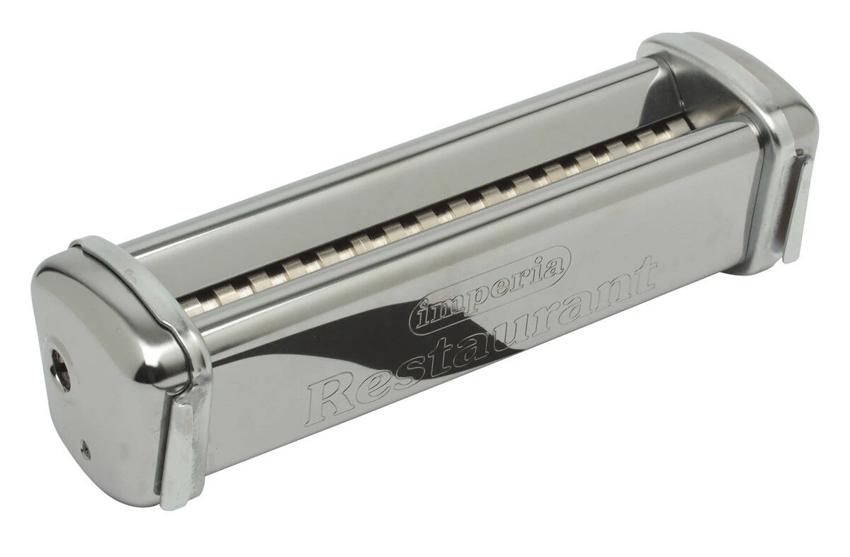 Met het opzetstuk voor de Imperia Restaurant pastamachine snijdt u de deegvellen uit tot de gewenste pastaslierten. De snijrollers hebben een doorvoerbreedte van 21 cm en kunnen worden gebruikt op zowel handmatige als de elektrische Imperia professionele pastamachines met een doorvoerbreedte van 21 cm.