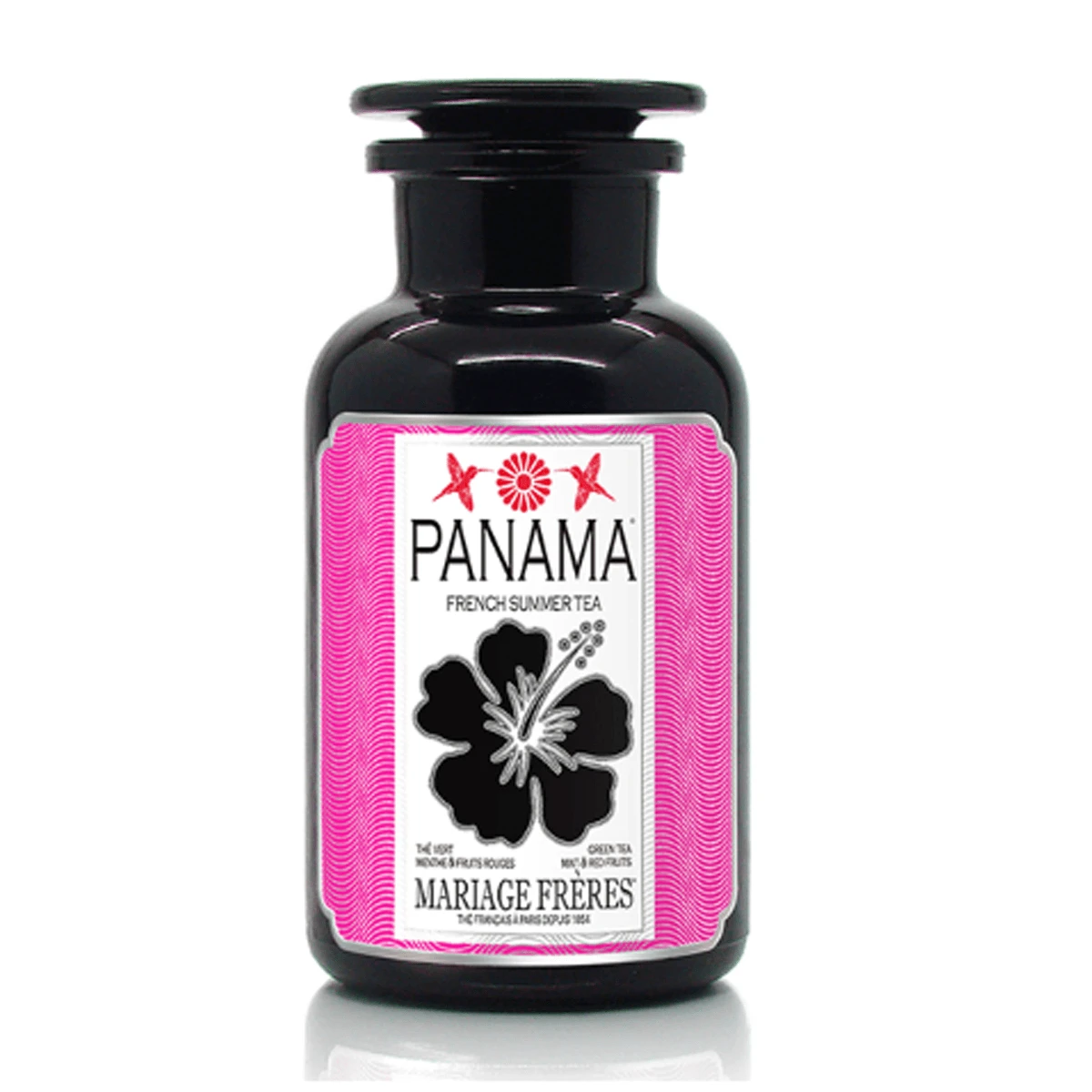 Een hoogwaardige dorstlesser bij hoge temperaturen! Mariage Frères Panama ijsthee komt in een glazen pot met 140 gram losse theeblaadjes. De inhoud is voldoende voor het maken van 24 liter ijsthee. De ijsthee is op basis van munt, rode bessen, hibiscus en korenbloemen en heeft een lichtzoete, fruitige smaak.