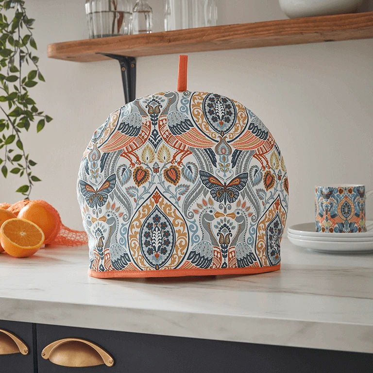 De Cotswold theemuts van Ulster Weavers is vervaardigd van katoen en voorzien van een polyester vulling voor isolatie. Gebruik de theemuts om uw theepot langer op temperatuur te houden. De theemuts is voorzien van een vrolijk motief met vogels en vlinders op een oranje ondergrond. De theemuts is 35 cm lang en 27 cm hoog.